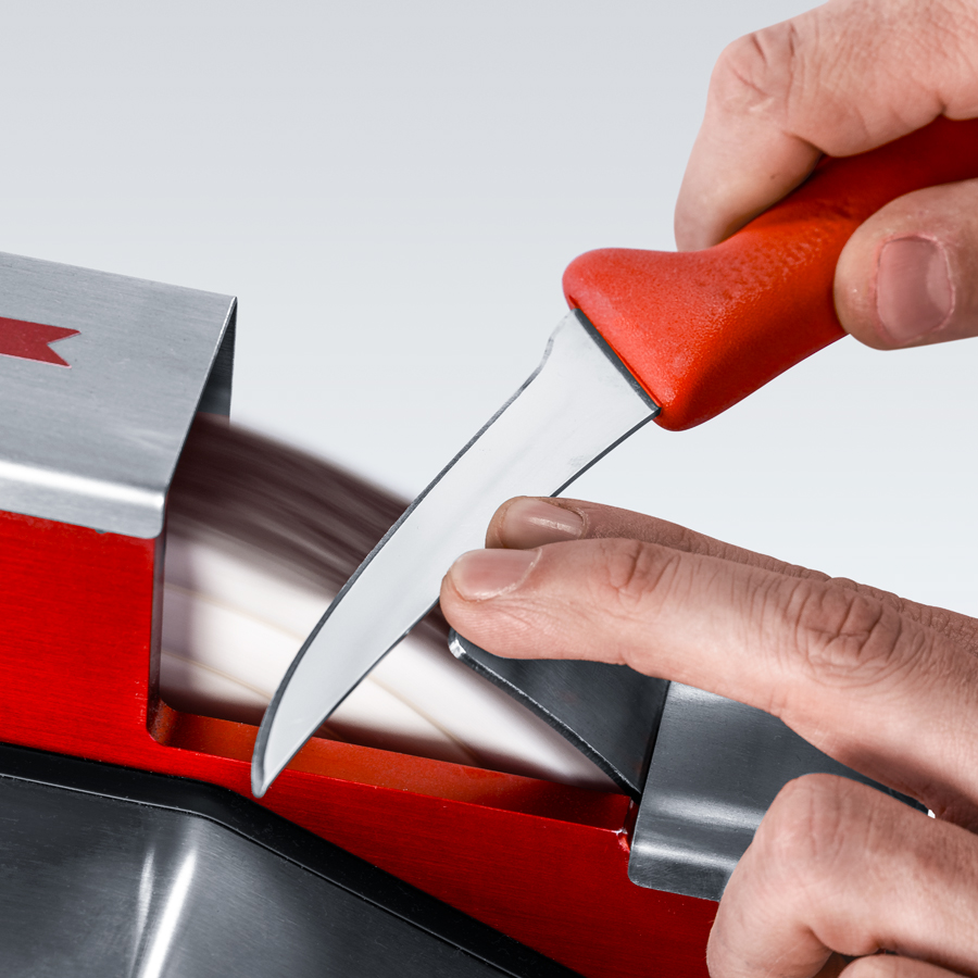 Das Schleifverfahren basiert auf zwei ineinandergreifenden Spiral-Schleifscheiben. Dadurch wird sichergestellt, dass die Handmesser immer mit dem richtigen Schneidenwinkel angeschliffen sind. Die beidseitige Anordnung der Spiral-Schleifscheibe ermöglicht das gleichzeitige Schleifen beider Seiten der Messer in nur einem Durchgang.